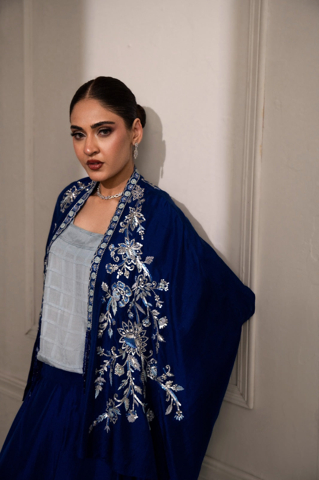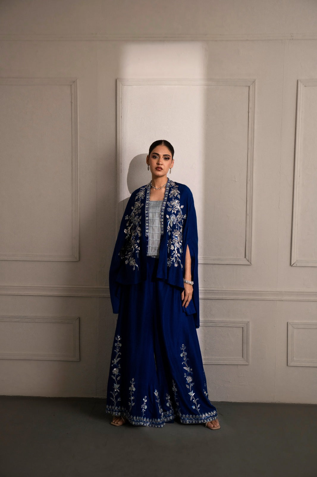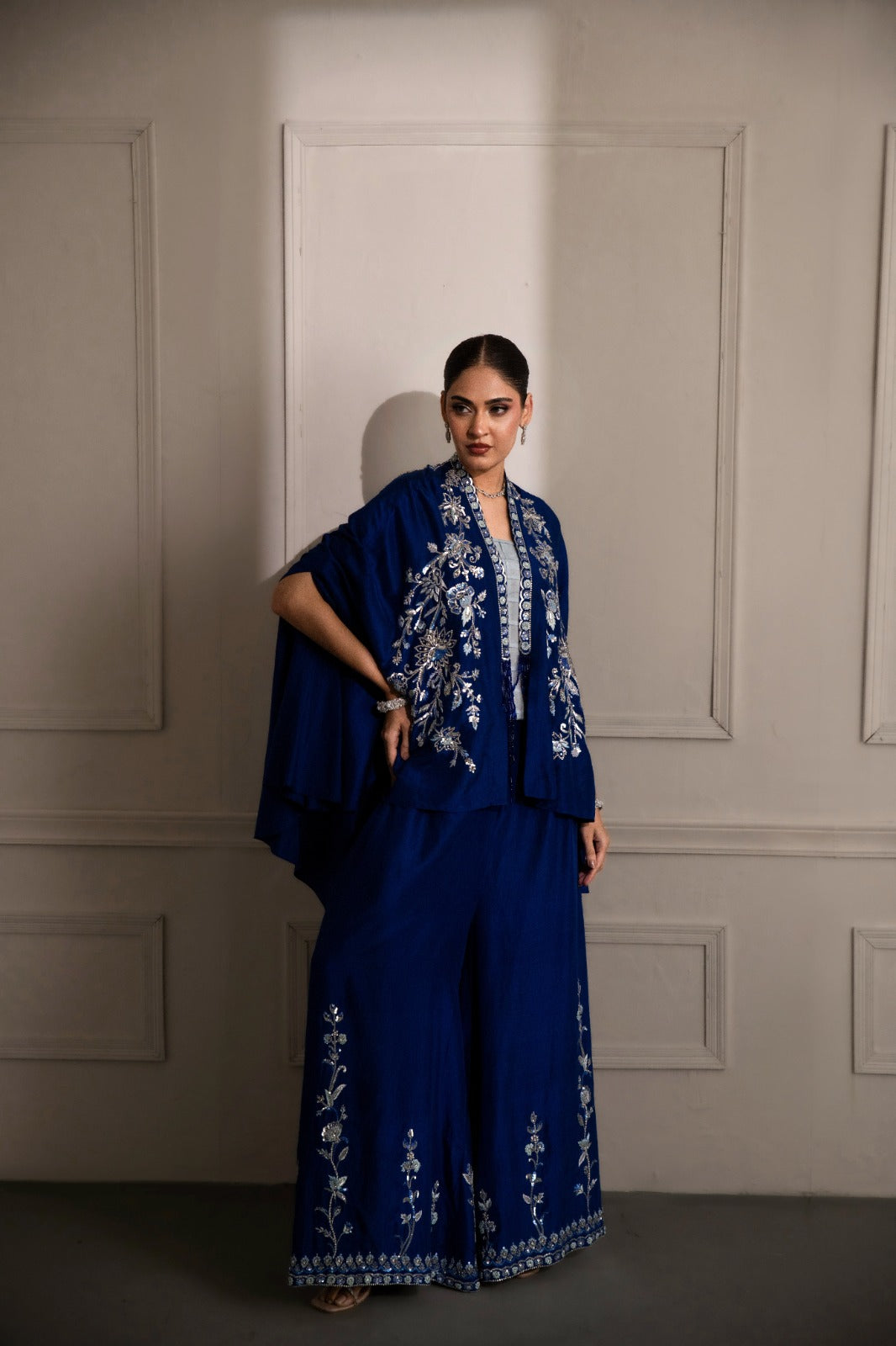 stunning blue ensemble crafted from luxurious