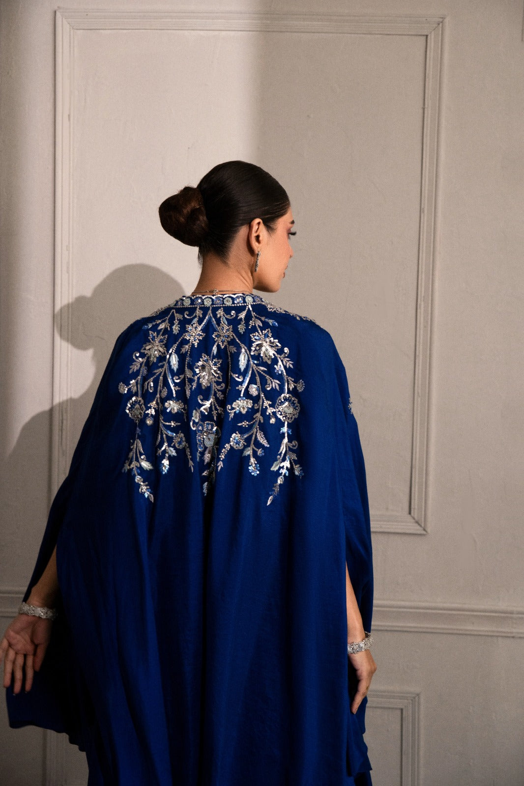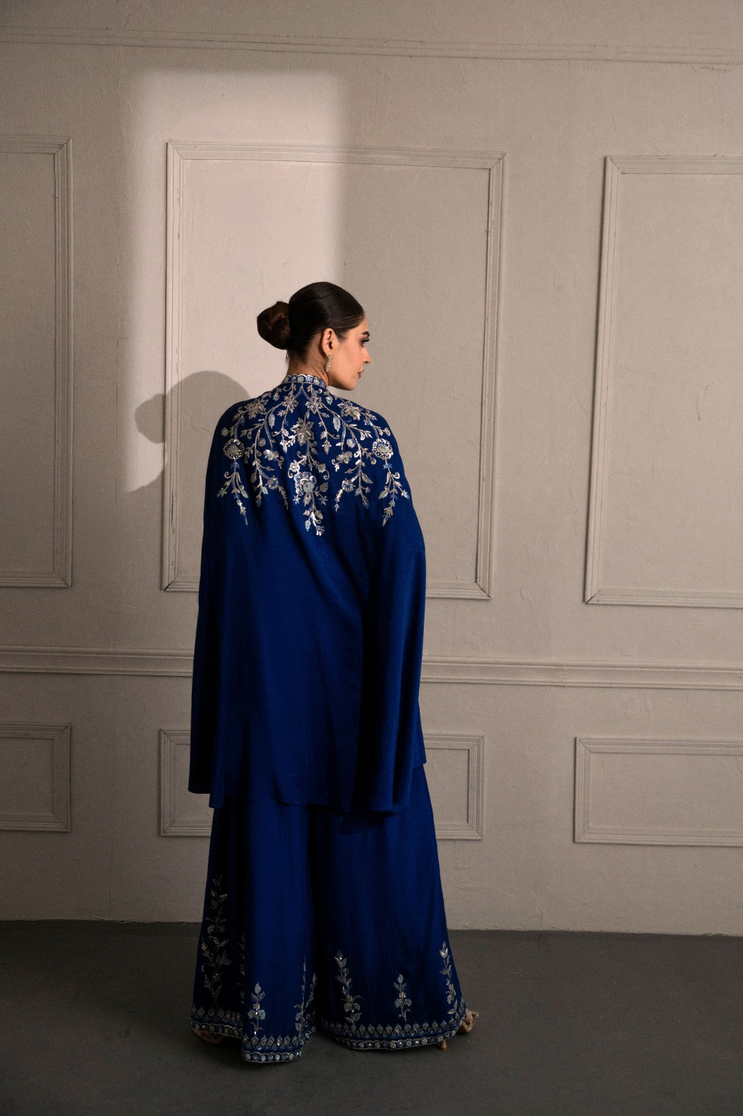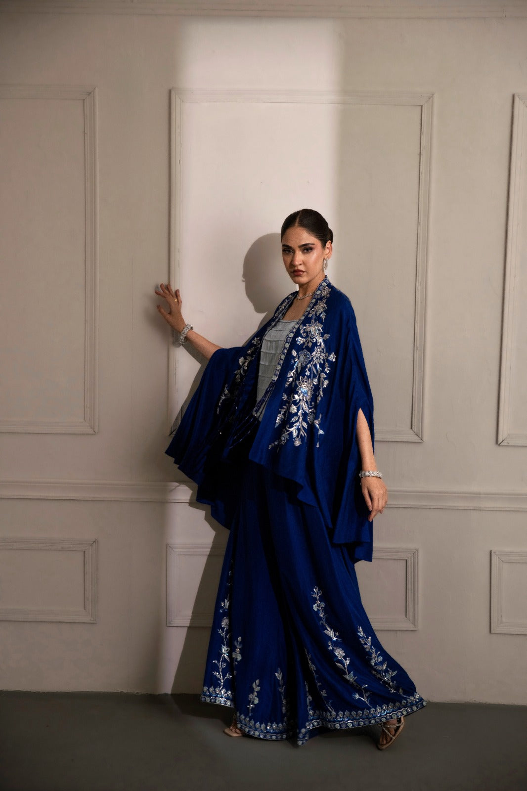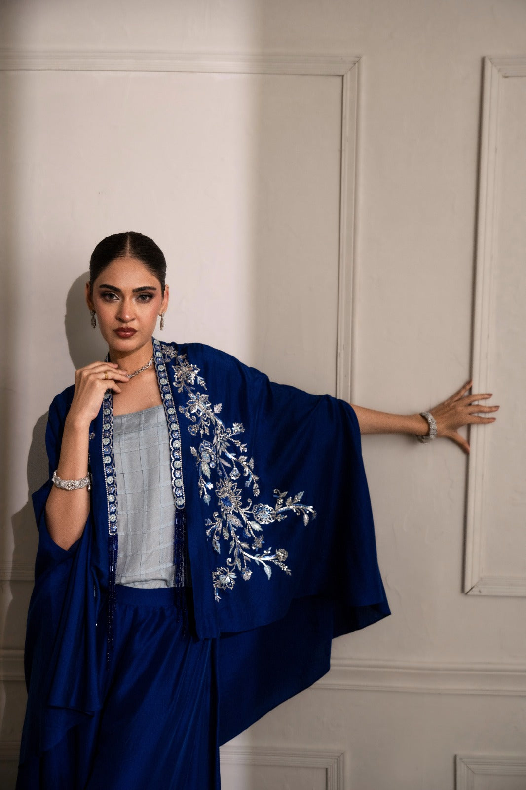 stunning blue ensemble crafted from luxurious