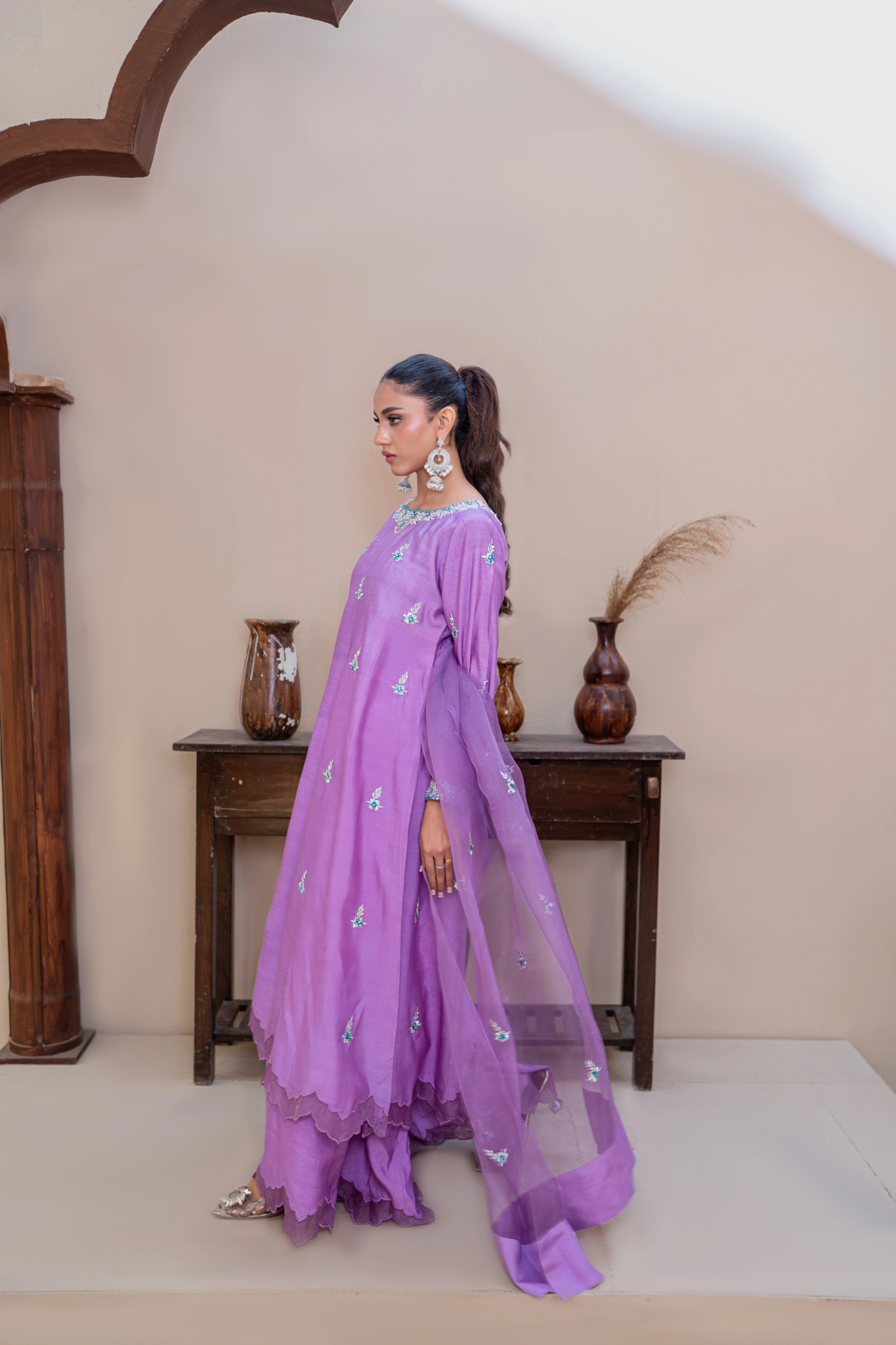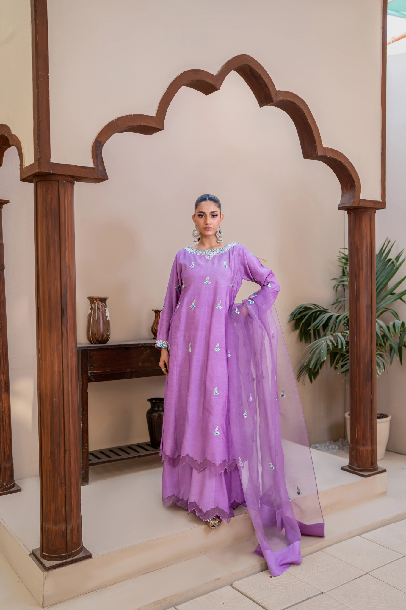 This Khadi silk shirt featuring elegant embroidery and embellishments, paired with plazo pants and a sheer organza dupatta. A soft, feminine and luxurious festive ensemble.